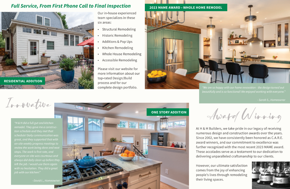 Our Mission is to Improve our lives and the lives of those we work with by remodeling homes. we strive to consistently exceeding everyone's expectations. We are a Structural Design/Build company with a focus on working with families who want to enhance their lives through remodeling their home. When we add space to a home it often changes the way people use their home. Many families want to entertain more, reach out to their neighborhood, or have to ability to remain in an area they love. We feel that remodeling a home is better than using natural resources to build a new home.